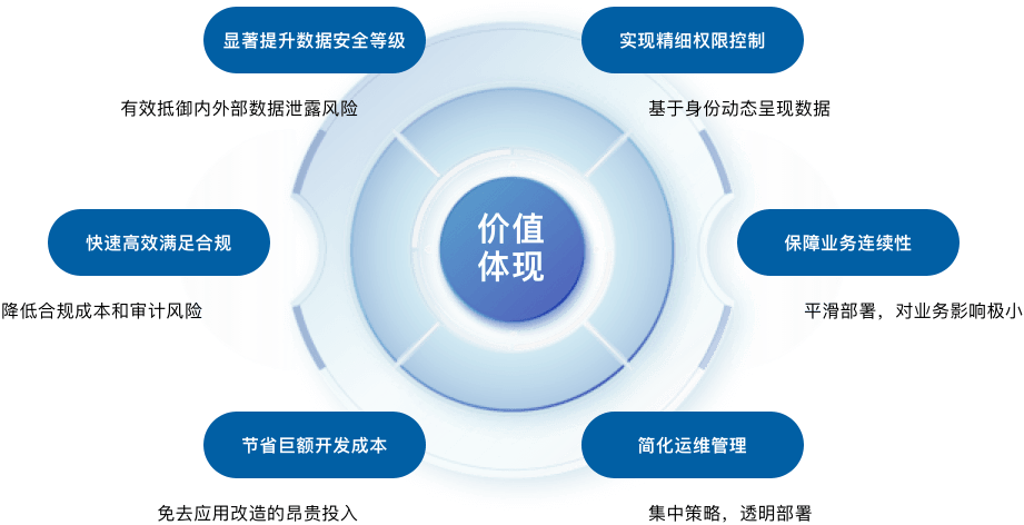在不修改现有应用程序代码、不改变用户使用习惯的前提下,实现数据库字段级的数据加密、脱敏和精细化的权限控制,从根本上解决 “明文存储、越权访问”的数据安全核心风险。